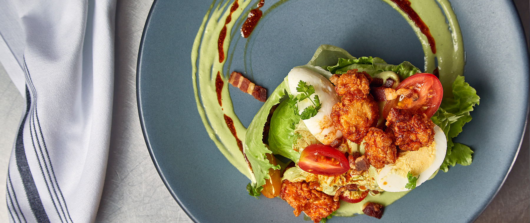 baby iceberg, avocado mousse, bacon, tomato, farm egg, nashville hot chicken bites, blue cheese crumbles, ranch dressing